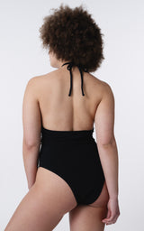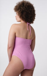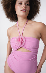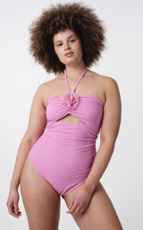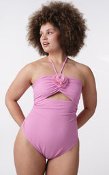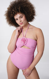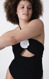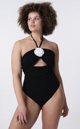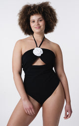 The Ilia one-piece is the epitome of modern elegance, blending sleek sophistication with versatile styling. Featuring a bandeau-style top with a chic halter tie, this swimsuit is elevated by a striking cutout detail that enhances its flattering silhouette. The centerpiece—a delicate white rose—adds a timeless, feminine touch, creating a bold contrast against the deep black crinkled stretch fabric. Available in Black & White and Pink, it's a must-have for effortless sophistication.