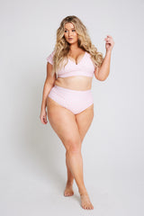Model, Hunter, wears size 2X in the Pink Houndstooth Lover "Cheeky" Bottoms.