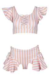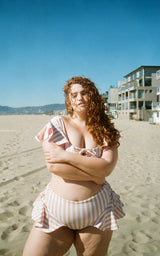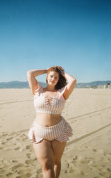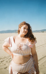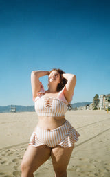 Bring your swimwear fantasies to life with the gorgeous Naomi bottoms. Available in Cabana striped Beige with Rosé lining, these whimsical bottoms feature flirty ruffles that create beautiful movement with every step you take. Adjustable lace-up sides make it easy to achieve your perfect fit. Everyday is an adventure when you’re wearing swim bottoms this cute. Pair the Naomi bottoms with the Naomi top and you will be queen of the beach.