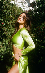 A daydream come to life, the Midi Length Wrap Skirt is a true treasure. Designed with a sexy side slit for showing off your legs, this stunning skirt also features a flattering twist to accentuate your waist and hips. The long slit makes it easy to move and dance all day and night. Pair this breathtaking skirt with the coordinating Lucky top in mountain dew satin for a selfie-worthy outfit you’ll want to document.
