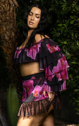 Feminine with a wild edge, the Tatum Set is sold as a two-piece matching set featuring a flirty off-the-shoulder ruffle top and a coordinating high-waisted mini skirt.