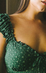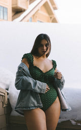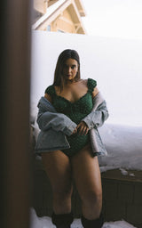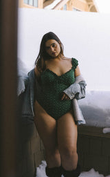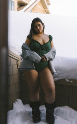 There is something so magical about spending the day in a winter wonderland making snow angels, drinking hot apple cider, and wandering around the ski resort shops. The Elle one piece was made for every snow princess looking for something ultra-romantic and feminine to wear on a rest day after skiing all week long. Featuring beautiful ruffle princess cap sleeves, a sweetheart neckline, and a front tie, this stunning suit is the one piece you have been dreaming of. Wear it with our yoga pants or your favorite jeans for the perfect daytime look. Then slip off your bottoms and spend an evening relaxing in the hot tub under the stars. This stunning one piece is made from a beautiful stretch eyelet fabric and comes in green, baby blue with red contrast, and black with baby pink contrast.