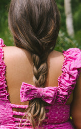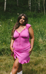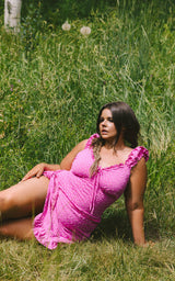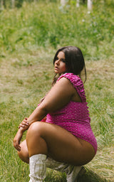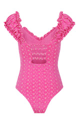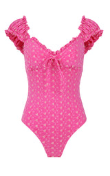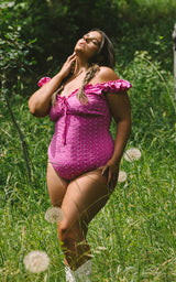 The Elle one piece was made for every a princess looking for something ultra-romantic and feminine to wear. Featuring beautiful ruffle princess cap sleeves, a sweetheart neckline, and a front tie, this stunning suit is the one piece you have been dreaming of. Wear it with our yoga pants or your favorite jeans for the perfect daytime look. Then slip off your bottoms and spend an evening relaxing in the hot tub under the stars. This stunning one piece is made from a beautiful stretch eyelet fabric and now comes in pink!