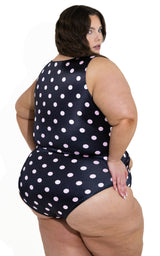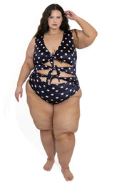Powerful, sculpting, and undeniably feminine, The Goddess One-Piece in Polka Dot is designed to command attention. Crafted in our signature glossy stretch swim fabric, this statement silhouette blends vintage-inspired charm with bold, modern edge.