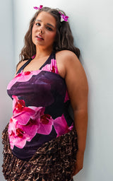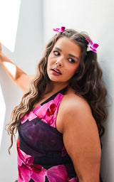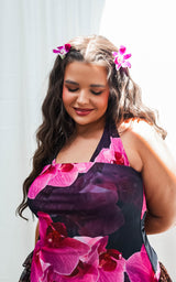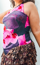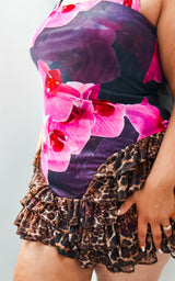 Introducing our captivating Whispering Mesh Dress, a versatile and alluring piece that seamlessly transitions from beachside elegance to evening chic. Crafted from lightweight and breathable mesh fabric, this dress features an enchanting orchid print with delicate touches of leopard ruffles at the hem, exuding an air of exotic allure.