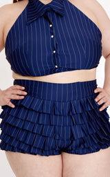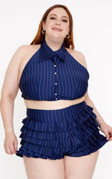 Stand out with our Bridget top, a versatile style that celebrates body positivity. This halter top boasts an adjustable back bow tie for the perfect fit, and the delicate pearl buttons down the front add a touch of elegance. Pair it with our Alma Skirt for a look that exudes confidence and charm. Discover the freedom to ring hire online with our made-to-order designs, proudly crafted in LA, available in sizes from XS-6X.