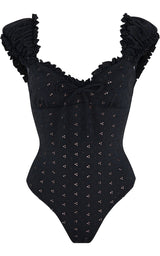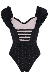 There is something so magical about spending the day in a winter wonderland making snow angels, drinking hot apple cider, and wandering around the ski resort shops. The Elle one piece was made for every snow princess looking for something ultra-romantic and feminine to wear on a rest day after skiing all week long. Featuring beautiful ruffle princess cap sleeves, a sweetheart neckline, and a front tie, this stunning suit is the one piece you have been dreaming of. Wear it with our yoga pants or your favorite jeans for the perfect daytime look. Then slip off your bottoms and spend an evening relaxing in the hot tub under the stars. This stunning one piece is made from a beautiful stretch eyelet fabric and comes in green, baby blue with red contrast, and black with baby pink contrast.