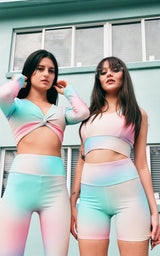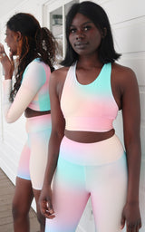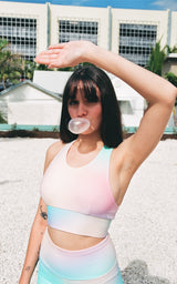 Indulge in this sweet treat, the Sweetie sports bra is here to make all of your activewear dreams come true. Featuring a luxuriously thick, smoothing band around the midriff, the Sweetie sports bra flatters all body types and will stay in place while working out or moving around. Buttery soft, Brazilian blend activewear fabric in cotton candy print feels like heaven on earth for your curves. Thick shoulder straps offer generous support and all-day comfort. Wear this to barre or yoga class under a slouchy sweater, or style it as a crop top with high-waisted jeans or a flirty skirt, the Sweetie sports bra was designed for your active, multi-faceted life.