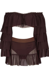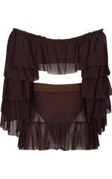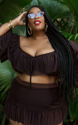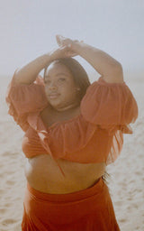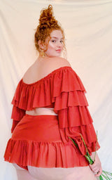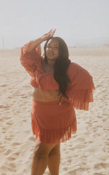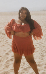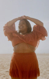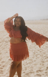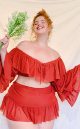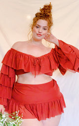 The Tatum top is the summer crop top you have been dreaming of. This flirty piece features layers and layers of ruffles down the arms and a tiny bow on the front. Designed for dancing, twirling, pool parties, and dinner dates, the Tatum top is made from breathable mesh and is light as a cloud. Pair this long-sleeved top with the matching Tatum skirt or your favorite high-waisted pants for maximum desert goddess vibes.