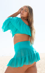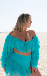 The Tatum top is the summer crop top you have been dreaming of. This flirty piece features layers and layers of ruffles down the arms and a tiny bow on the front. Designed for dancing, twirling, pool parties, and dinner dates, the Tatum top is made from breathable mesh and is light as a cloud. Pair this long-sleeved top with the matching Tatum skirt or your favorite high-waisted pants for maximum desert goddess vibes.