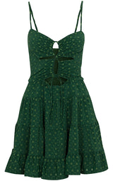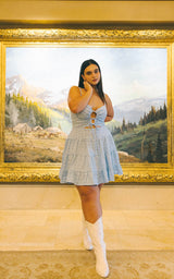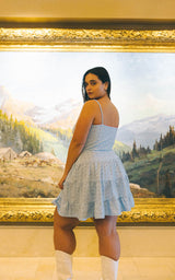 Admire the masterpiece paintings in the ski resort entrance hall while drinking a welcome glass of Pinot Grigio in the gorgeous The Sophie Dress. This unforgettable piece features adjustable criss cross ties up the front so it makes every woman’s curves look amazing. A flouncy three-tiered ruffle skirt completes the look and makes this the perfect dress for dancing the night away under the snowflakes and stars. This dress is made from the finest stretchy eyelet fabric and comes available in three stunning color-ways: green, baby blue with red contrast, and black with baby pink contrast.
